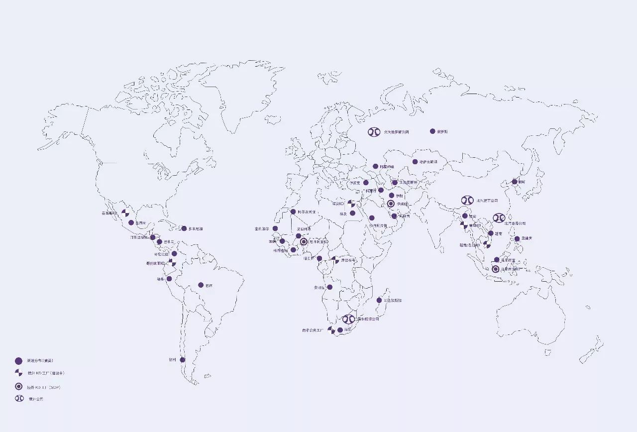 北汽集團響應國家“一帶一路”倡議,在海外不斷落子,努力實現“世界北汽”的戰略構想。北汽集團已在全球47個國家搭建銷售網絡154家、建設海外產業基地4家、境外公司7家、KD項目22個。