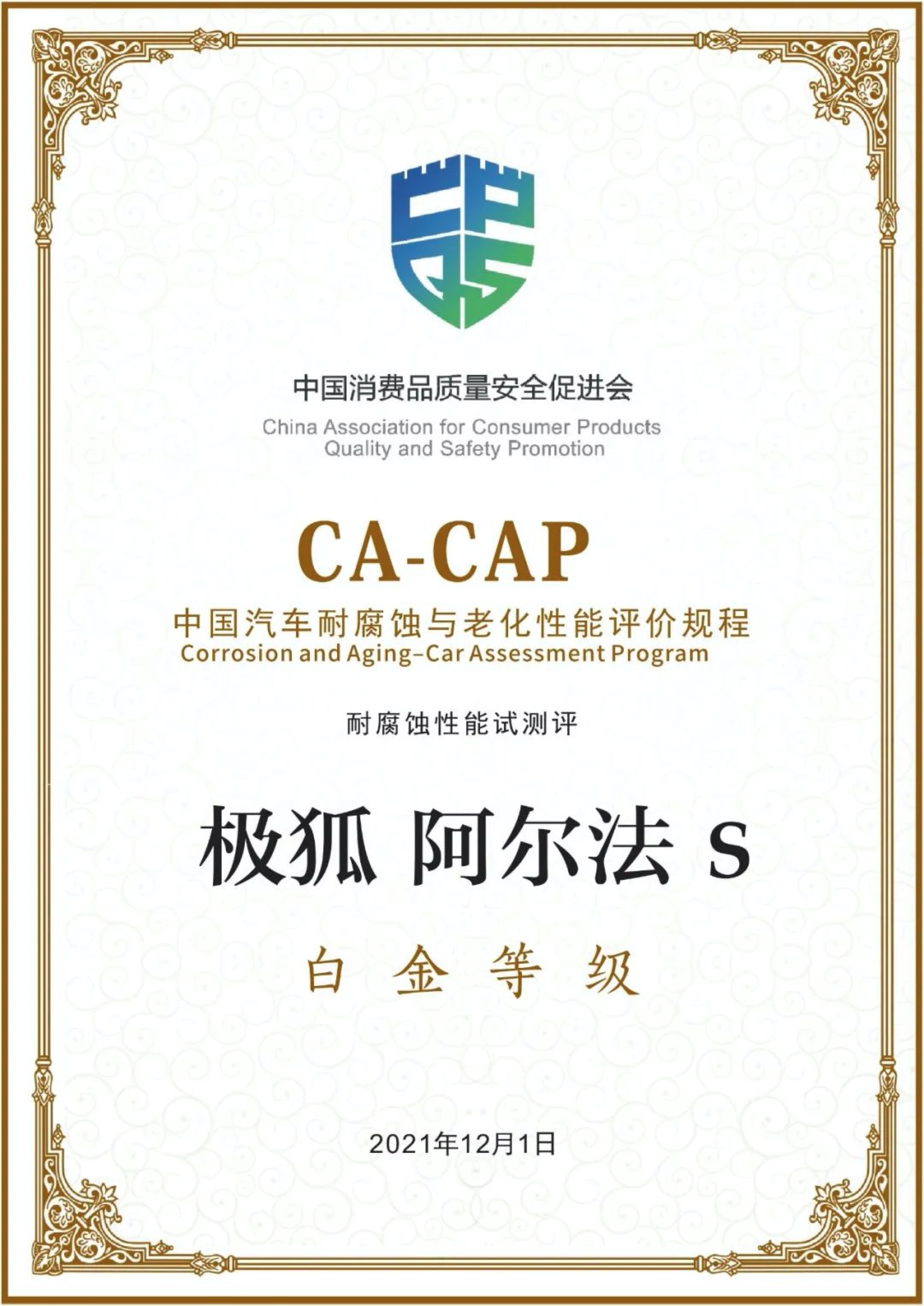 Established under the General Administration of Quality Supervision, Inspection and Quarantine of China, China Association for Consumer Products Quality and Safety Promotion (CACPQSP) is an authoritative organization focusing on consumers’ rights and interests. CA-CAP is organized and conducted by CACPQSP. Implemented in accordance with the Evaluation Regulation for Passenger Car Corrosion Resistance Test, CA-CAP simulates the anti-corrosion performance of a complete vehicle after six years of use in a highly corrosive area in China. Only the vehicles rated a 5-star can be qualified for a platinum-level certificate.