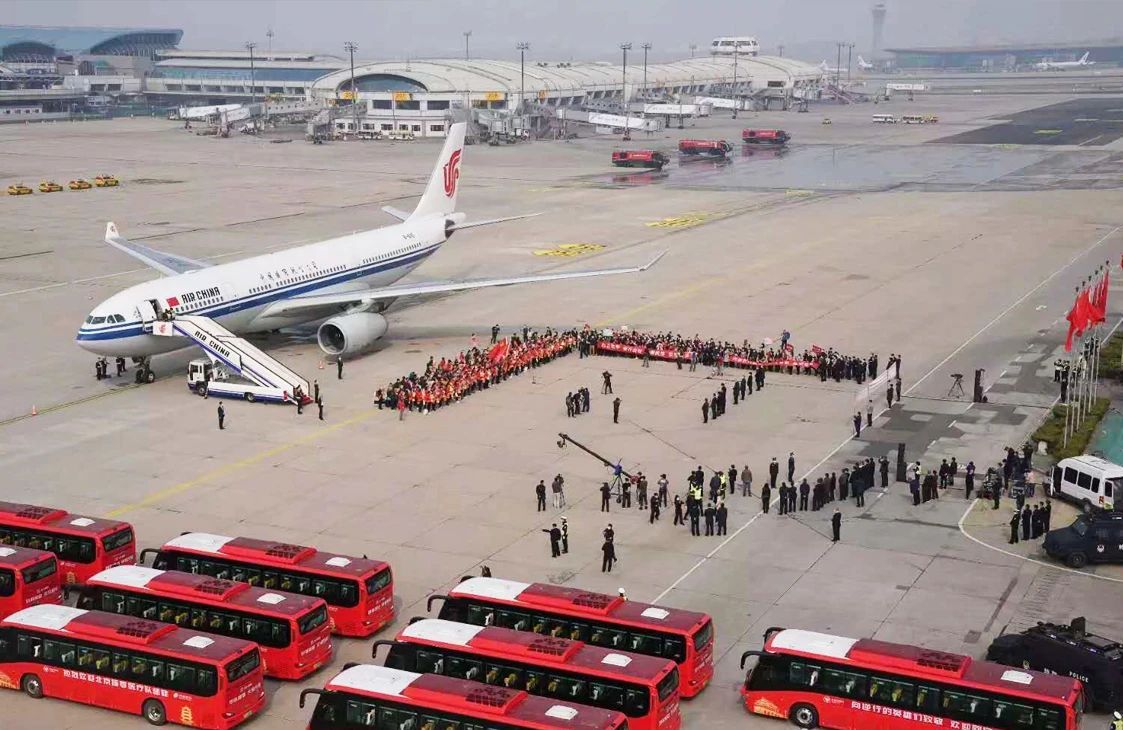 下午2點多,在首都機場停機坪,一輛輛北汽福田歐輝新能源高端商務大巴列隊排開,車頭裝飾著綢布紅花,紅色車身張貼著“熱烈歡迎北京援鄂醫(yī)療隊凱旋”的標語,靜靜等待著即將抵達的返京醫(yī)療隊。終于,醫(yī)療隊員們乘坐的航班降落在首都機場,機場以民航界最高禮遇“過水門”迎接英雄,為他們“接風洗塵”。艙門緩緩打開,隊員們手持國旗、鮮花,依次走下舷梯。前來迎接的隊員家屬代表、醫(yī)護人員代表、機場工作人員或肅立注目,或揮手歡呼,以各自的方式向這些北京英雄們表達著最崇高的敬意。