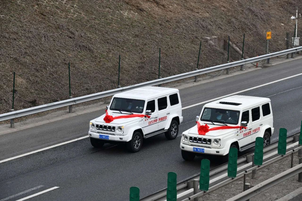 短暫的歡迎儀式后,醫(yī)療隊員們坐上北汽福田大巴。在警車護衛(wèi)下,黑色BEIJING-EU7純電動汽車作為引導車,白色北京越野BJ80作為押尾車,車隊浩浩蕩蕩行駛在首都的公路上,把醫(yī)療隊隊員們送到指定地點休養(yǎng)。