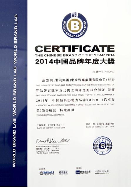 12月29日, 2014“中國(guó)品牌年度大獎(jiǎng)”頒獎(jiǎng)典禮在京舉行,北京汽車集團(tuán)有限公司(簡(jiǎn)稱北汽集團(tuán))榮獲中國(guó)品牌年度大獎(jiǎng)。這也是北汽集團(tuán)2014年自躋身《中國(guó)500最具價(jià)值品牌》后再度榮獲品牌大獎(jiǎng)。